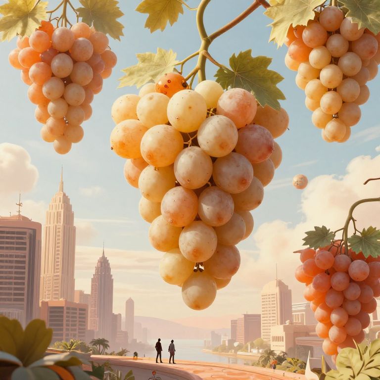 Grapes transform into a winged formation, soaring gracefully above rows of verdant vines in a sunlit vineyard, where nature's artistry defies gravity against a backdrop of fluffy clouds.