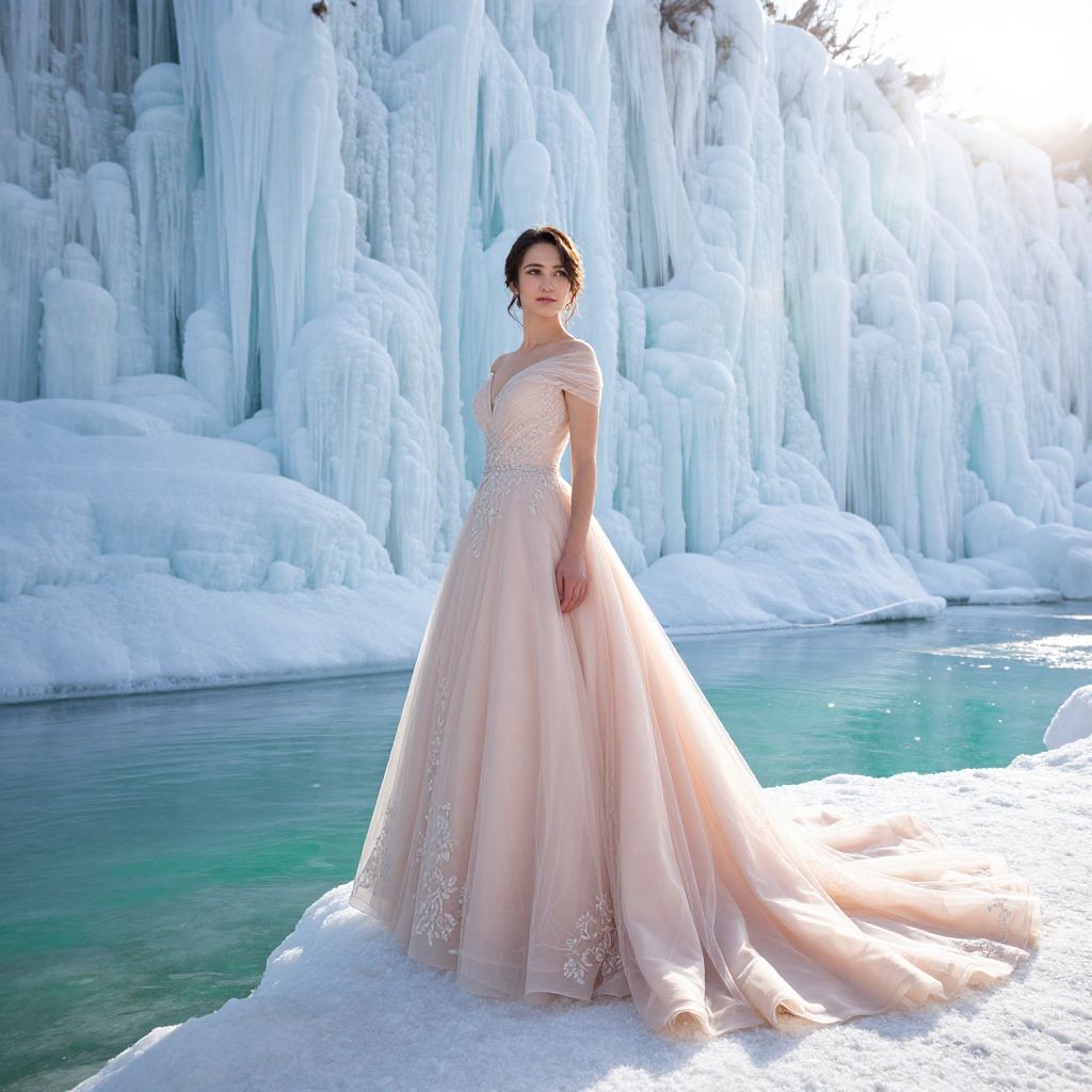 Elegant silhouette of a woman in a flowing peachy-pink wedding dress stands gracefully amidst icy formations, her gown cascading into the shallow, turquoise water as sunlight filters through the frosty backdrop.