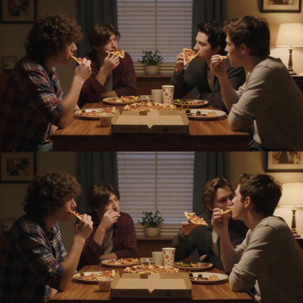 Photograph of four young men with curly and straight brown hair, sitting around a wooden table eating pizza. They are dressed in casual shirts, with one in a plaid shirt. The table has pizza boxes, plates, and disposable cups with floral patterns. They are sitting in a warmly lit room with beige walls, a window with blinds, and framed pictures. All four are mid-bite, smiling and engaging with each other, creating a relaxed, friendly atmosphere. The image is divided into two horizontal panels, showing the same scene from slightly different angles.