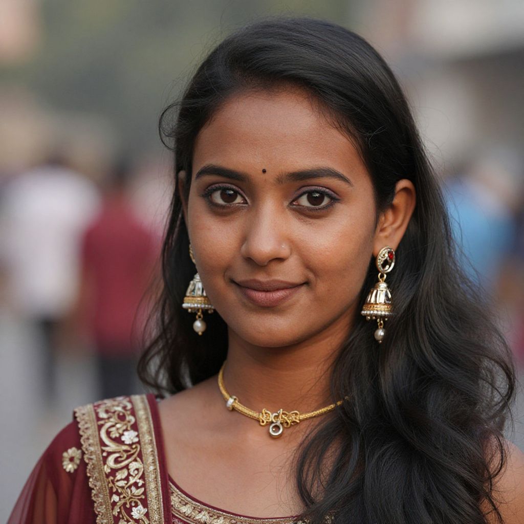 Photograph of an Indian woman with medium brown skin and long, wavy black hair. She has dark brown eyes and is wearing a maroon saree with gold embroidery, a gold necklace with a floral design, and gold earrings with bell-shaped pendants. A small bindi adorns her forehead. The background is blurred, showing indistinct people and buildings, suggesting an outdoor urban setting. She has a subtle, confident smile. The lighting is natural, highlighting her facial features and jewelry.