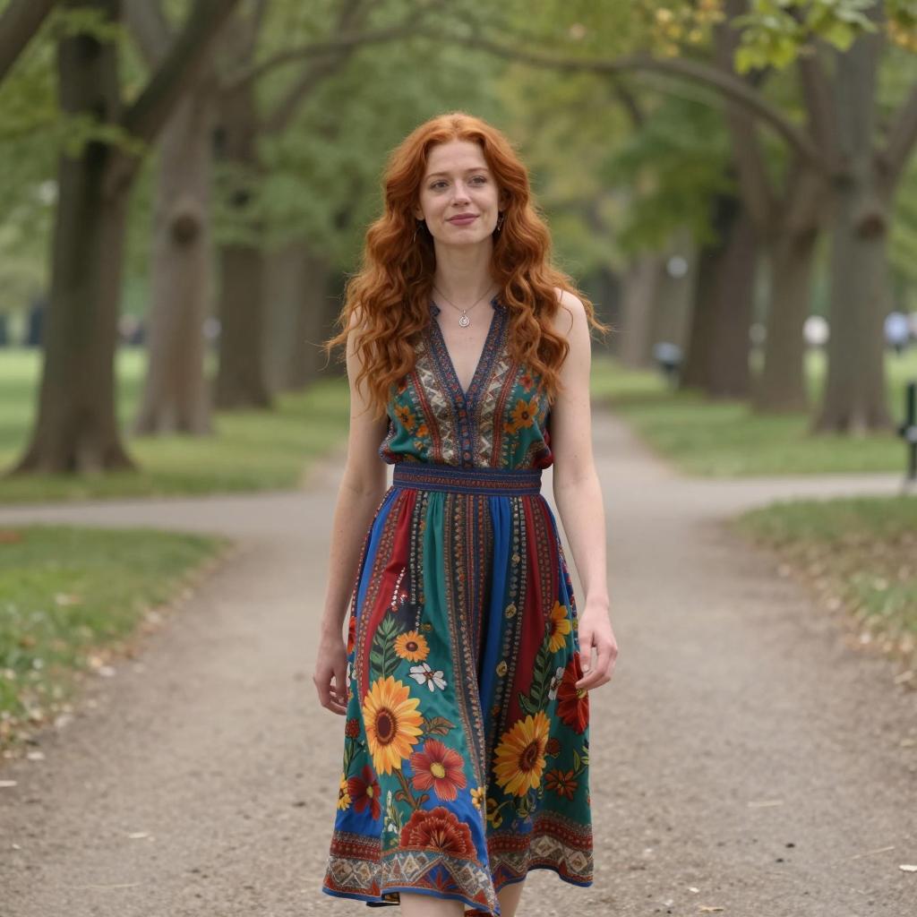 Daphne scooby doo movie, photograph of a young woman with red hair, wearing a colorful sleeveless dress with floral patterns in orange, purple, green, and yellow, standing in front of a stone building with steps, daytime, natural light, casual style, mid-length dress, necklace, bracelet, subtle smile, wavy hair, urban setting, slight tilt to the right, summer vibe