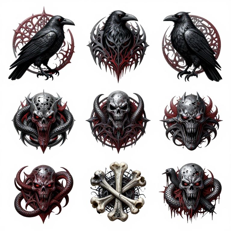 Deathcore logos incorporating menacing creatures like ravens and serpents, ornate tribal patterns, broken bones, and a distressed metallic finish with dark grey and crimson hues.
