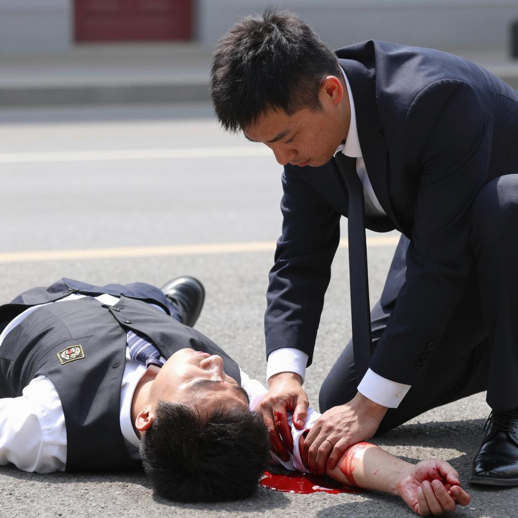 Two men in dark suits, one bleeding from a neck wound, lying on the ground. The other man, with intense focus, tends to the bleeding wound. Background is a blurred street. Blood on the first man's white shirt and black vest. Sunlight casts shadows. Both men have short, dark hair.