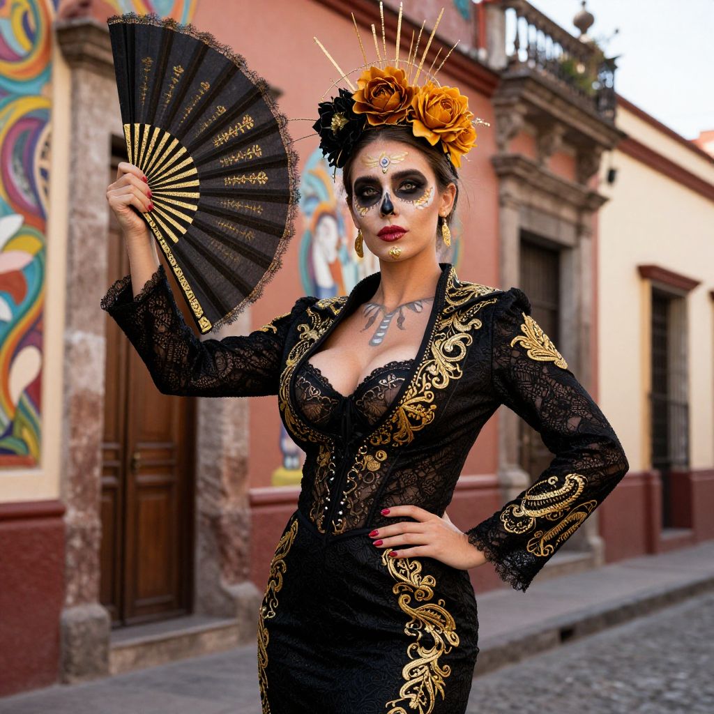 A tall, slender woman with fair skin, green eyes, and a strong, confident expression dressed in a full catrina costume — featuring a black and gold makeup look, a lace-trimmed embroidered jacket, and a fan that flutters in the breeze — posing in a dramatic 1930s-style Mexico City street scene with colorful murals and hand-painted buildings in the background.. The woman has big tits and cute face