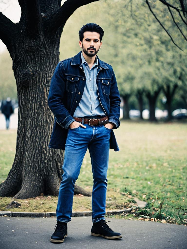 Style clothes, 1boy, male focus, solo, pants, denim, jeans, belt, hands in pockets, outdoors, coat, full body, black hair, blurry background, blurry, facial hair, blue pants, standing, jacket, looking at viewer, shirt, tree, black footwear