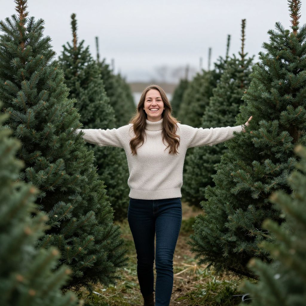 Smiling woman stands amidst rows of lush green Christmas trees at Jones Farms, her arms outstretched as she embraces the festive season.