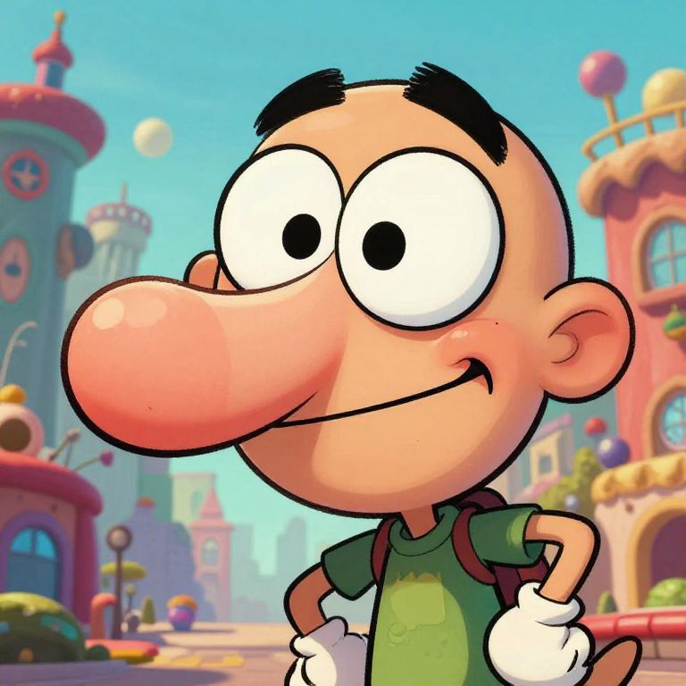 Cartoon-style image of a bald, wide-eyed boy with a large nose, wearing a green shirt and white gloves, standing confidently in a colorful,