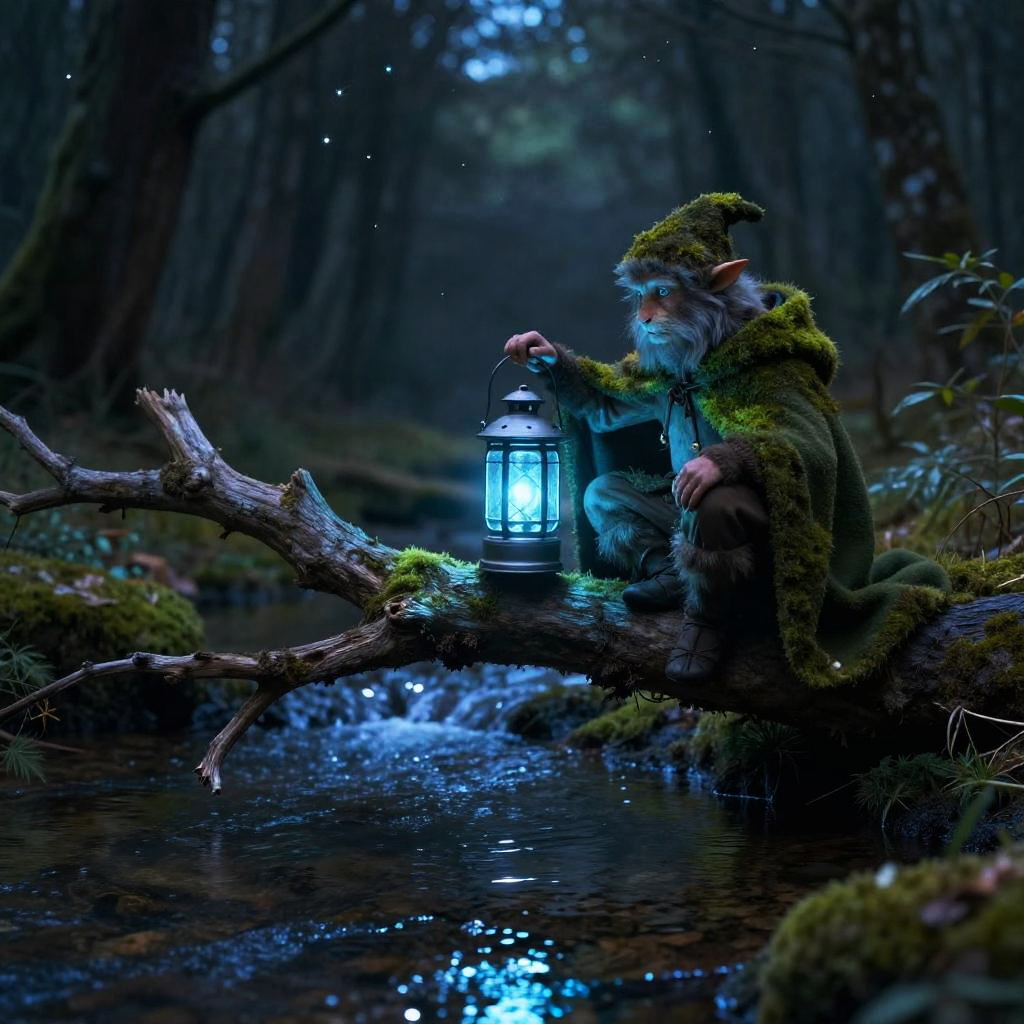 A vivid photograph of a mythical forest scene at night. A bearded, old, elf-like figure with pointed ears and green moss-covered attire sits on a mossy tree branch over a reflective creek. He holds a glowing blue lantern, casting a soft light on his face and illuminating the water below. The background is dark, with tall, shadowy trees and a subtle blue light filtering through the forest. Small, sparkling particles float in the air, adding a magical atmosphere. The elf's expression is thoughtful, and the scene evokes a sense of enchantment and solitude.