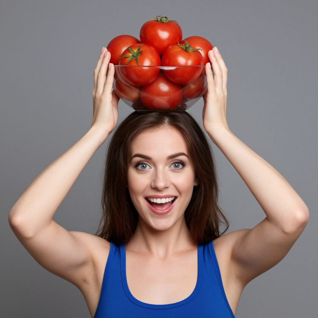 Photograph of a smiling woman with fair skin and long brown hair, wearing a blue tank top, balancing a bowl of red tomatoes on her head against
