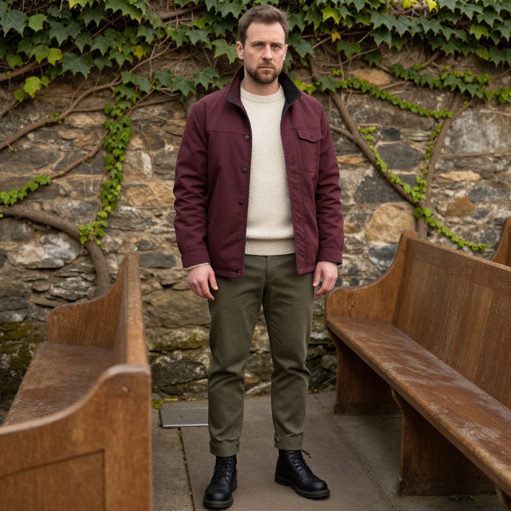 Photograph of a bearded man standing outdoors in front of a stone wall covered with ivy. He has short brown hair and a serious expression. He is wearing a maroon jacket over a white knit sweater, olive green pants, and black lace-up boots. The background includes wooden benches on either side, with the stone wall and ivy adding a rustic feel. The man is centered in the image, standing on a concrete path. The overall style is casual and slightly rugged.