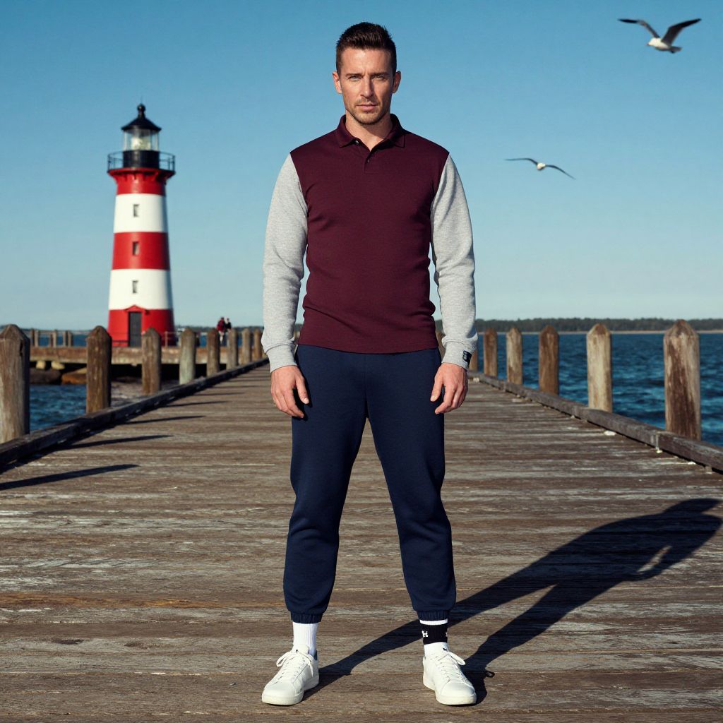 A man, tapered dark blue sweatpants, fitted heather gray sweatshirt, classic white sneakers, burgundy stretch-fit polo shirt, athletic ankle socks, historic lighthouse, weathered wooden piers, seagulls soaring, vibrant technicolor film stock, relaxed expression.Man has masculine face and piercing eyes