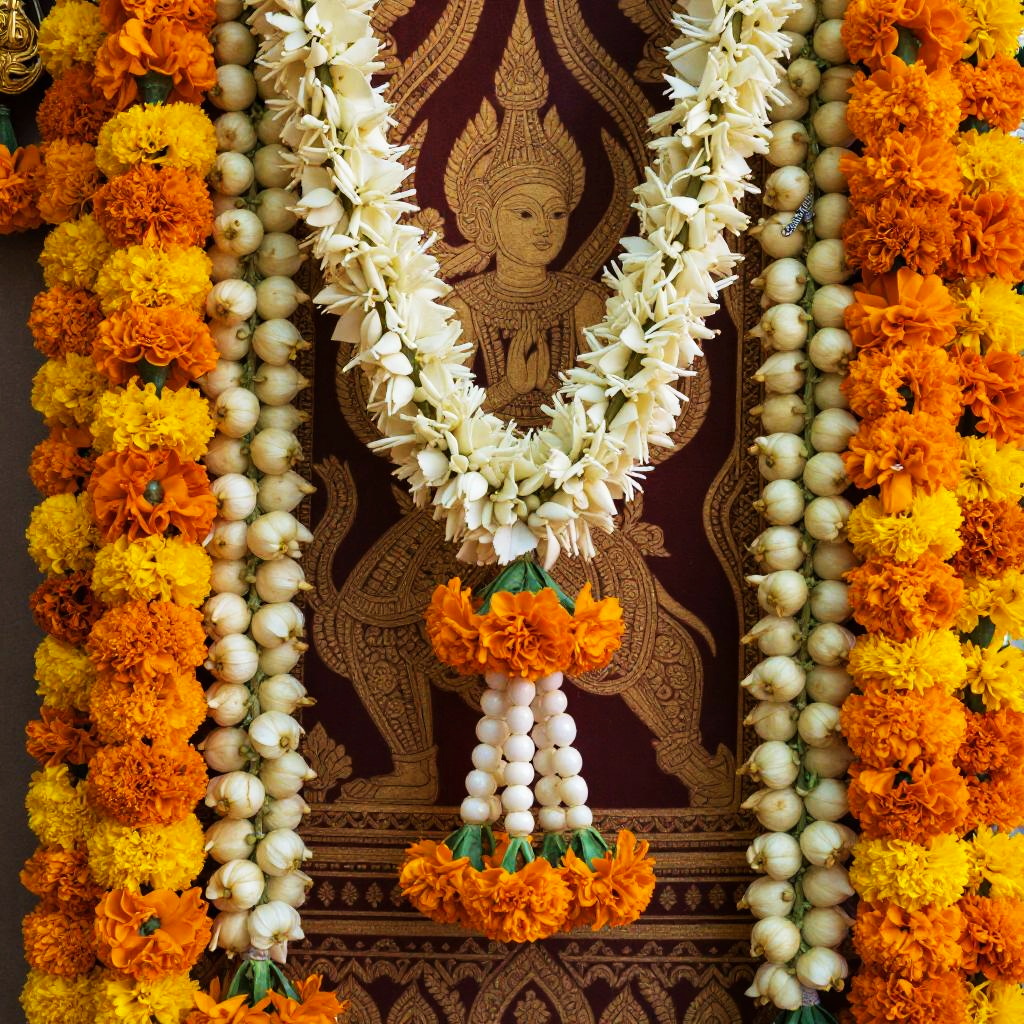 Tai floral design definition portrayed in a ceremonial setting with detailed marigold garlands and jasmine strands, intricate Thai artistry emphasized by vibrant color contrast.