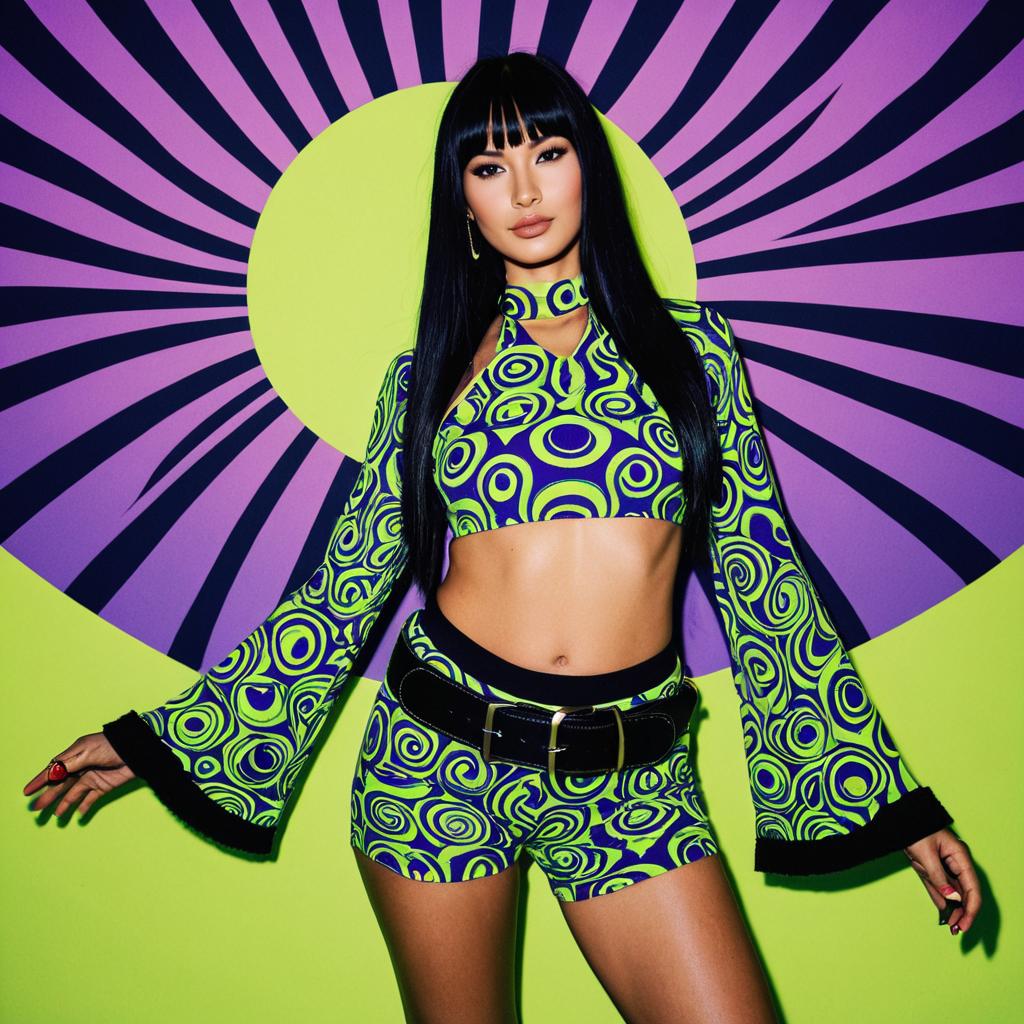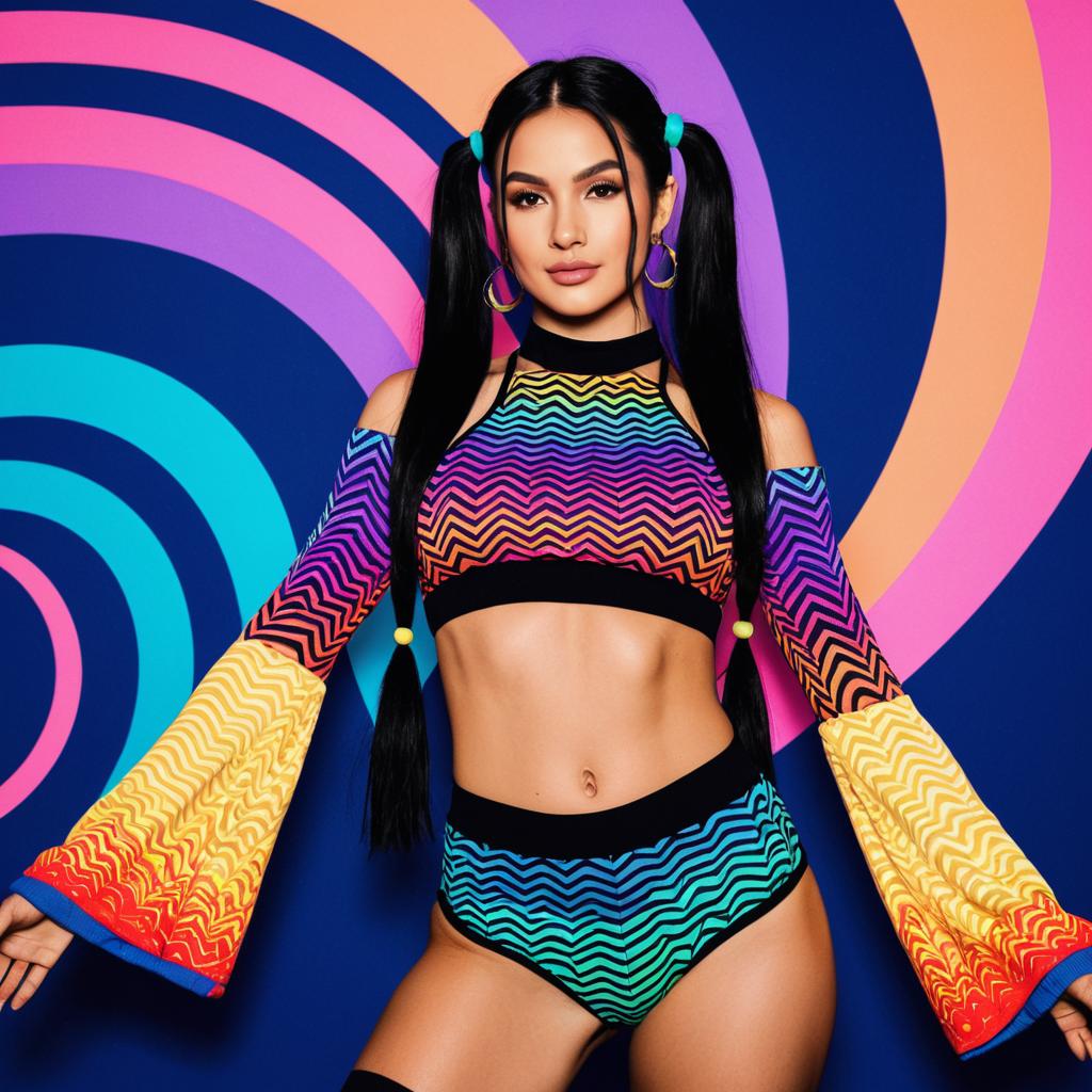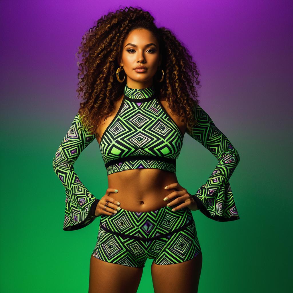 Slim tall woman wearing psychedelic print rave set with halter crop top, high-waisted bottoms and matching bell-sleeve arm warmers in neon rainbow gradients with black outlines on dark-skinned woman with braided space buns posed three-quarter turn with one arm hanging by side and the other bent in festival-style backdrop with soft abstract shapes, high-contrast lighting with subtle shadows, festival fashion photography, mid-length shot, high resolution, ultra-detailed