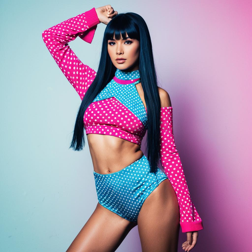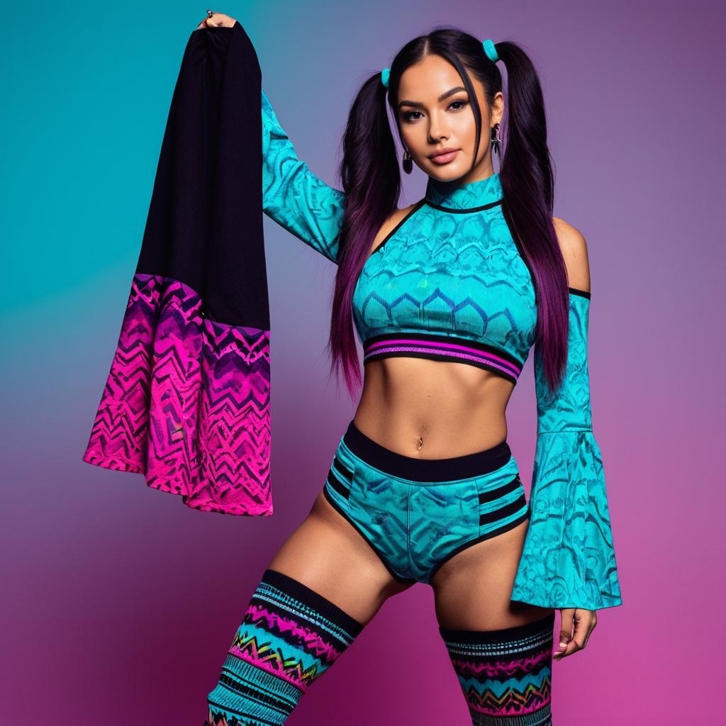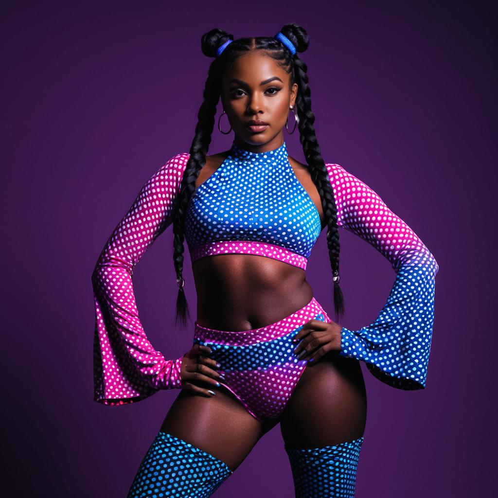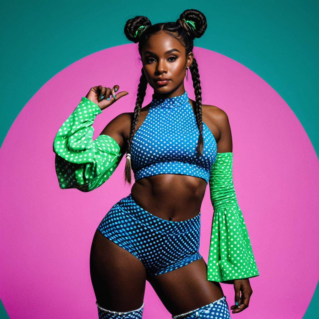Slim tall woman wearing psychedelic print rave set with halter crop top, high-waisted bottoms and matching bell-sleeve arm warmers in neon rainbow gradients with black outlines on dark-skinned woman with braided space buns posed three-quarter turn with one arm hanging by side and the other bent in festival-style backdrop with soft abstract shapes, high-contrast lighting with subtle shadows, festival fashion photography, mid-length shot, high resolution, ultra-detailed