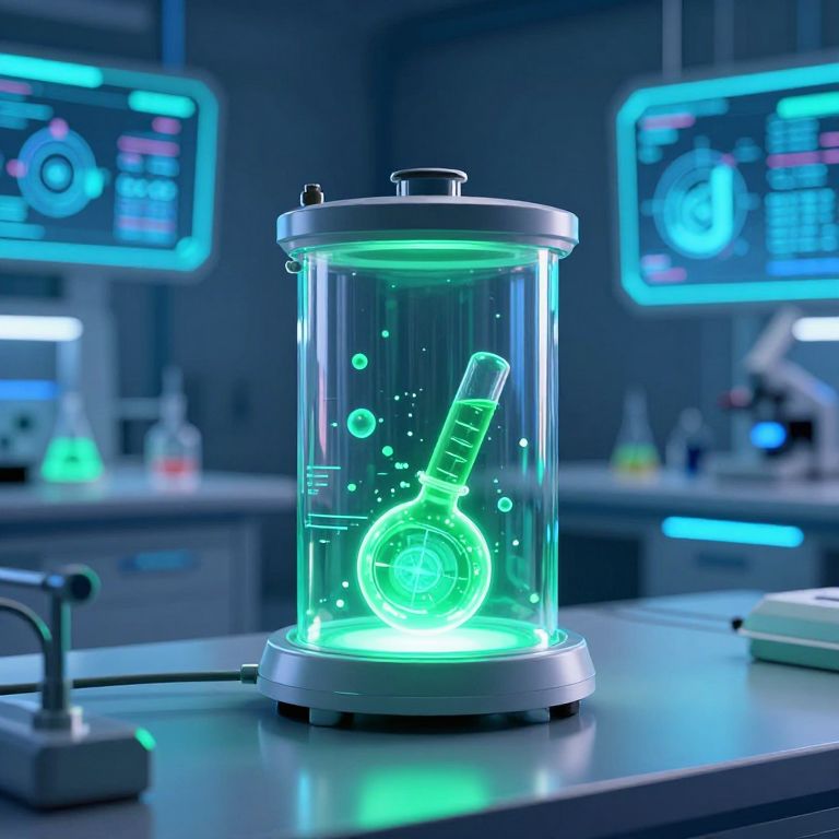 Canister on a futuristic laboratory table, sleek transparent container holding glowing chemical samples, ambient blue and green neon lights, high-tech environment with holographic displays, cyberpunk aesthetic, ultra-detailed and vibrant colors