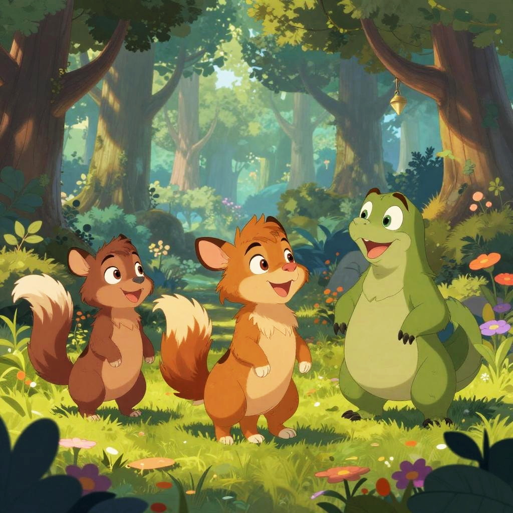 Disney style animals exploring a magical forest, vibrant colors, whimsical expressions, soft lighting, detailed fur textures, fantasy background, storybook illustration style