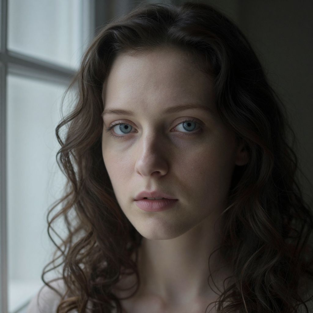 Photograph of a serious, fair-skinned woman with long, wavy brown hair and blue eyes, standing near a window with soft light.