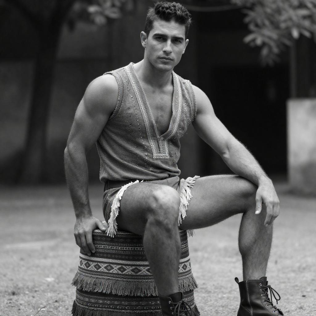Black-and-white photograph of a muscular man with short, dark hair, sitting on a fringed, patterned stool. He wears a sleeveless, ornate top, fringed shorts, and lace-up boots. His right hand rests on the stool, left hand on his knee. Background includes a blurred outdoor setting with trees.