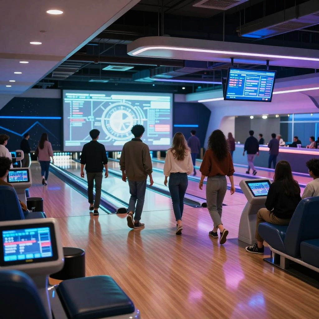 Futuristic bowling alley bustling with diverse people in futuristic attire, holographic advertising displays, high-tech seating with touch controls, sleek reflective floors and ambient mood lighting