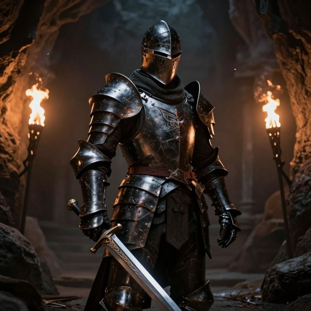 Black armored knight in a mysterious cavern lit by flickering torches, covered in scratched and battle-worn armor, holding a burning longsword, dark fantasy mood