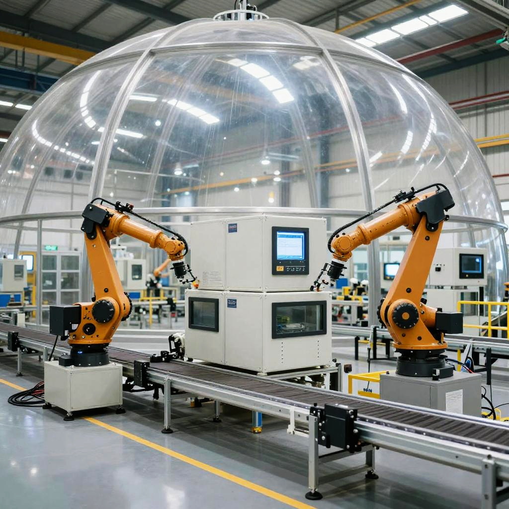 Anlagen architecture focusing on modular prefabricated units assembled into a high-tech factory, showing robotic arms and automated conveyor belts, set inside a large transparent dome with reflective surfaces and dynamic lighting.