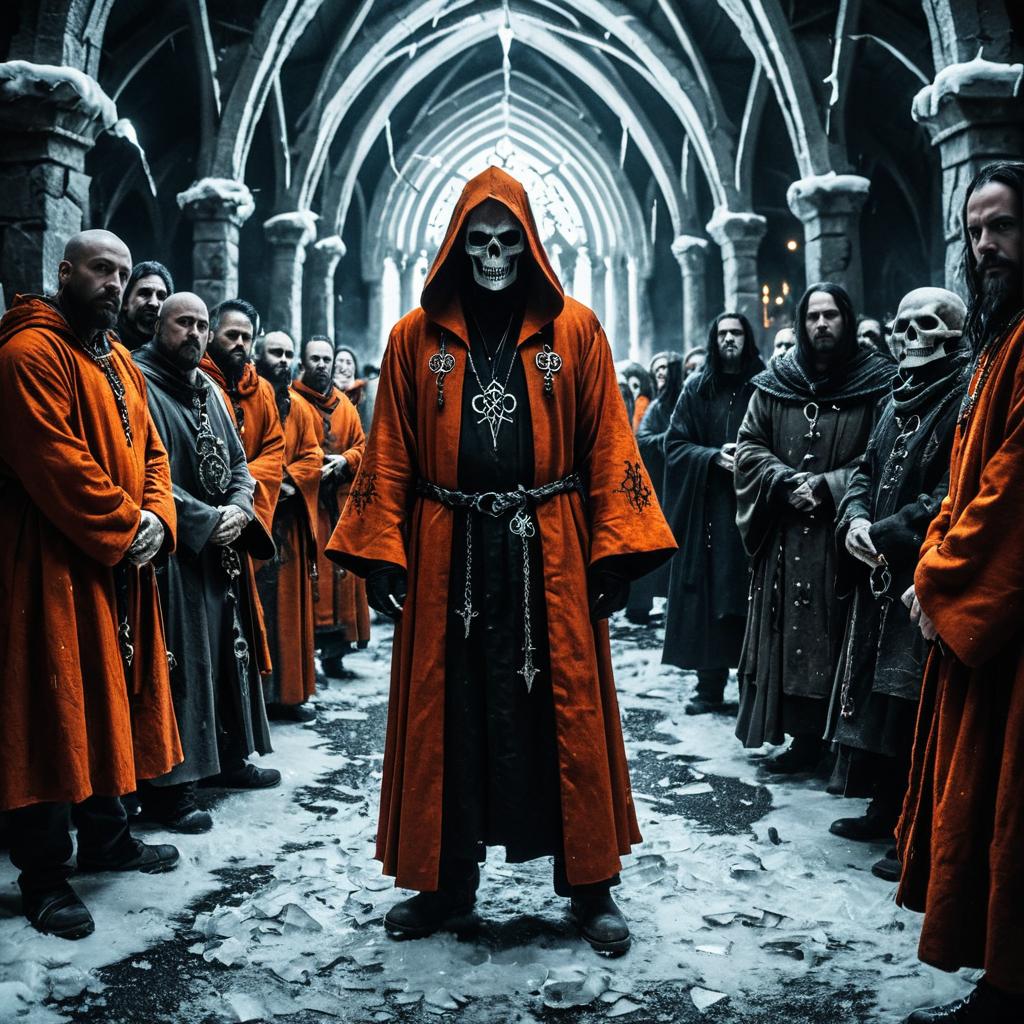 A gothic heretic wearing a burnt orange robe marked with cursed sigils stands in a large, dimly lit hall with vaulted arches. The figure has a skull face and black clawed gloves. The room is crowded with people in dark robes, illuminated by fire torches mounted on stone pillars. The floor is covered in snow, suggesting a cold, icy environment resembling a platinum ice valley. The scene features cinematic, hyper-realistic lighting with sparks and a dramatic atmosphere.