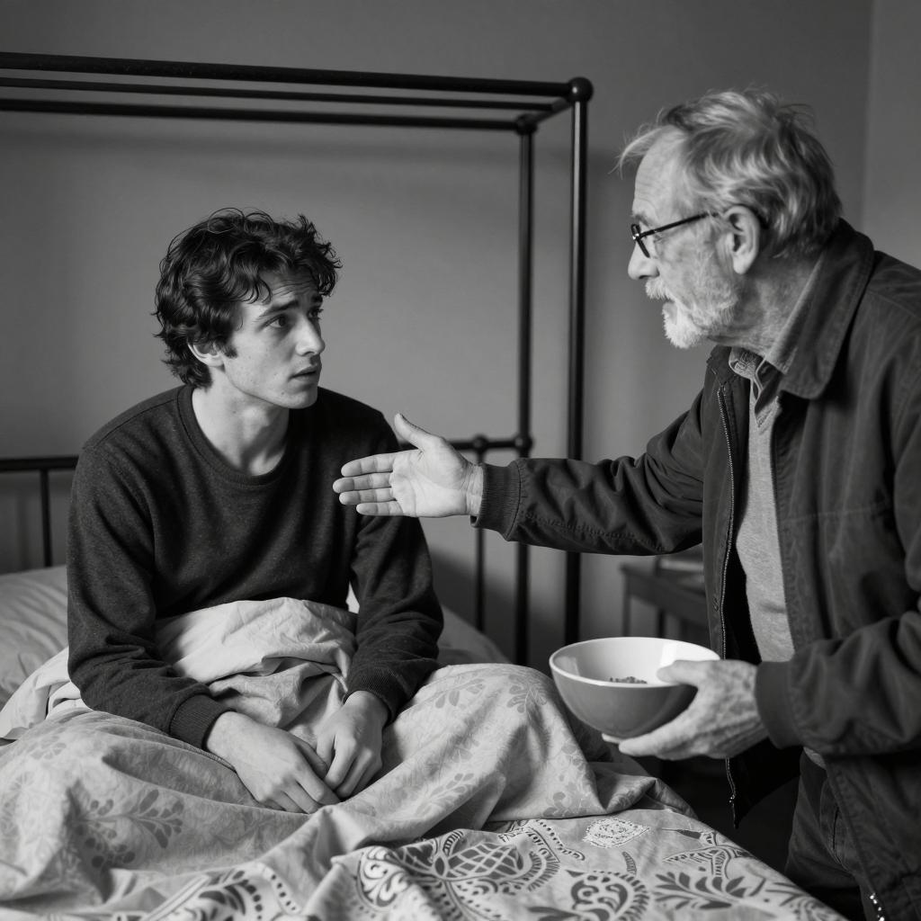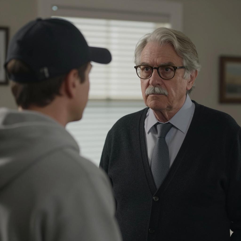 A photograph of a gym scene. An older man with a white hat and blue jacket, holding a cup, sits at a table labeled "Pay Here." A younger man with a black beanie and jacket stands facing him. Background: gym equipment, punching bags, and other people. A clear bottle labeled "No Entry" is on the table.