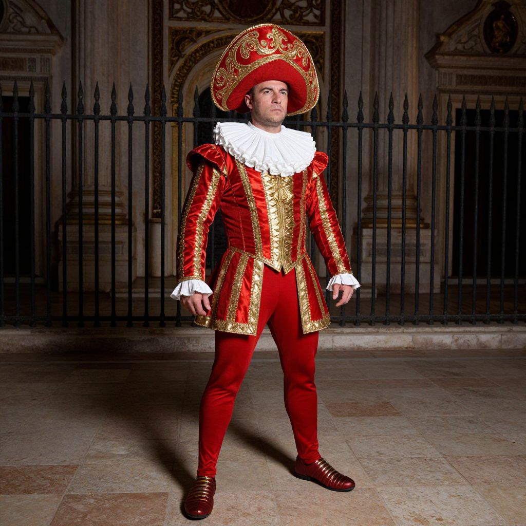 A man is dressed in a red and gold costume with a white ruffled collar and a large, ornate hat. The man is standing on a tiled floor with a fence in the background. He has a muscular build, a strong jawline, and a confident expression. The scene is set in a grand, historic setting with detailed architecture and intricate decorations. The lighting is dramatic, casting long shadows and highlighting the man's costume and features. The overall atmosphere is regal and mysterious, with a sense of grandeur and intrigue.