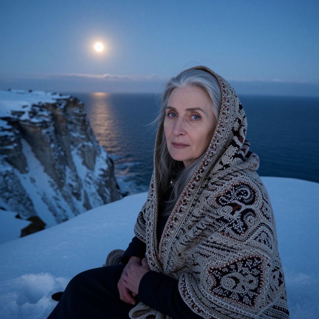 Photograph of a middle-aged woman with light gray hair, fair skin, and blue eyes, seated on a snowy cliff at dusk. She wears a thick, intricately patterned brown and white knitted hooded cloak, and looks directly at the camera with a calm expression. The background features a snow-covered cliffside overlooking a dark blue ocean, with the moon shining brightly in the twilight sky, casting a reflective path on the water. The overall color palette includes cool blues and whites, creating a serene, wintery atmosphere.