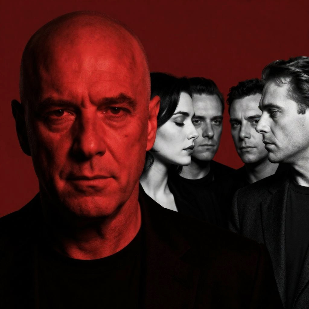 Poster of a film. Left side: large, intense close-up of a bald man's face in red, half-shadowed. Right side: black-and-white photograph of four men, including Michael Caine, facing a woman with closed eyes. Red background.