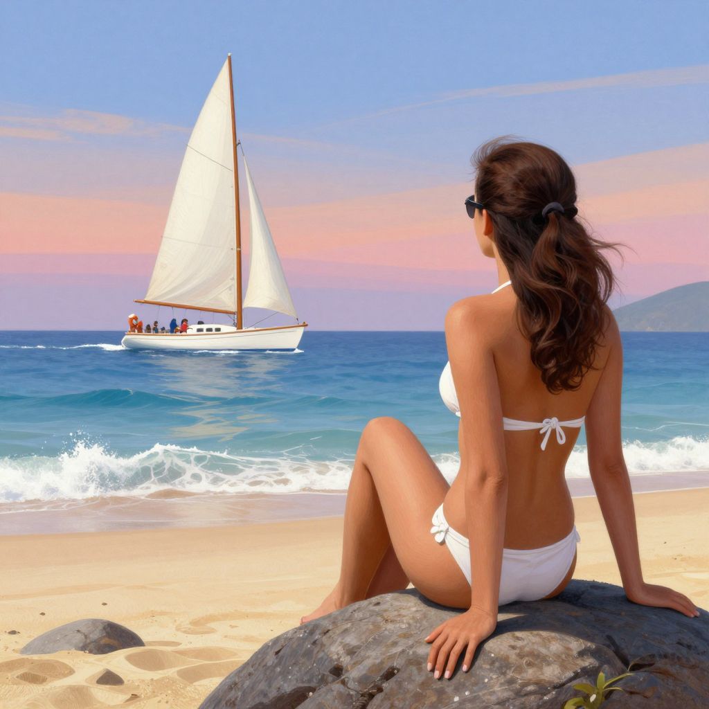 A serene beach scene rendered in high-definition realism captures a woman in a white bikini sitting on a rock, gazing at a majestic sailboat approaching under a vibrant sky, evoking a classic Steve Hanks-style coastal artwork.
