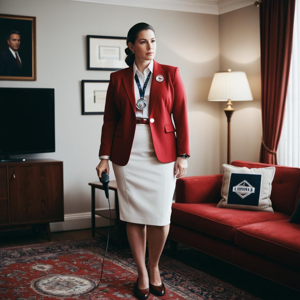 Photo of a Voluptuous woman, Slicked Back, news reporter outfit, wearing a Midnight Blue tailored blazer made of Velvet, a crisp white shirt, A-line skirt or slacks, classic pumps, holding a microphone accessory, with a press badge and a classic watch, library, soft natural lighting.