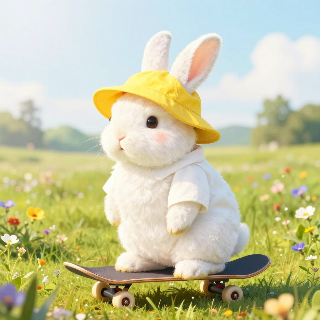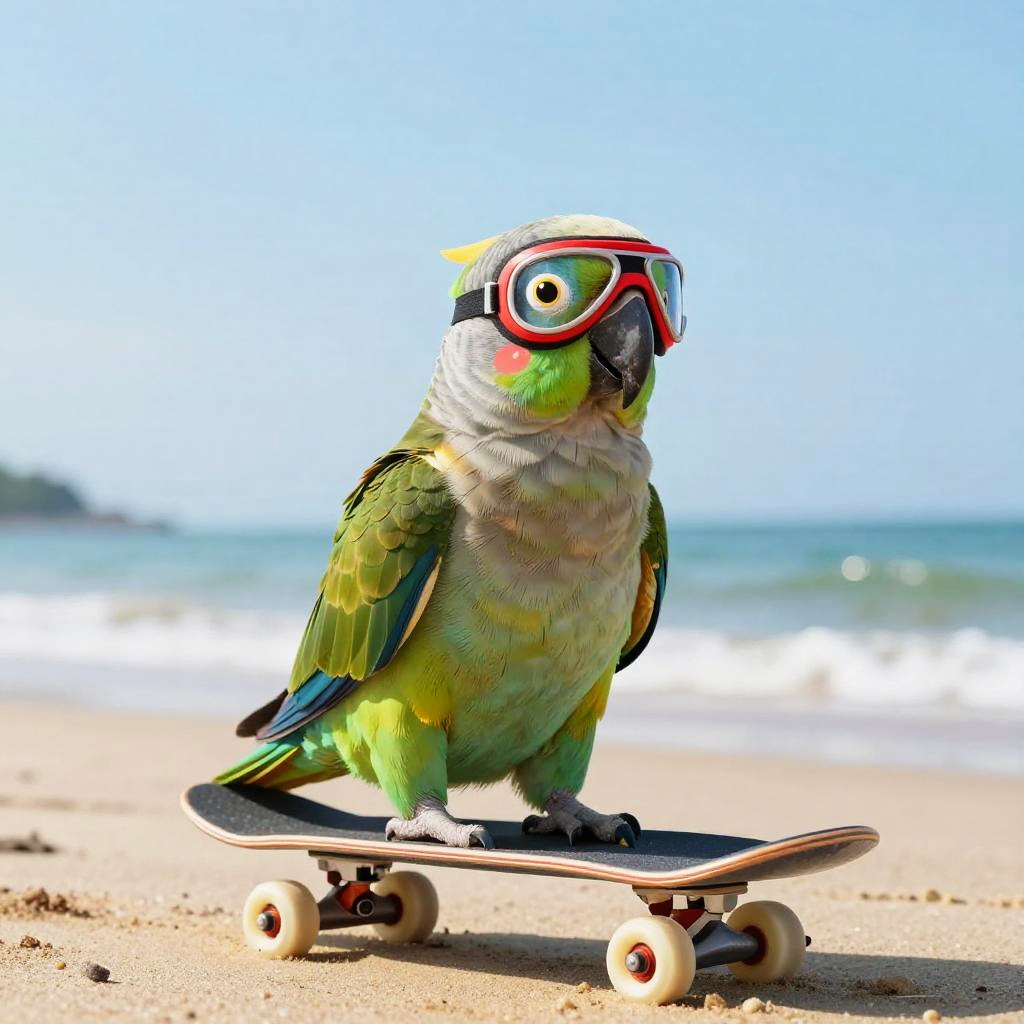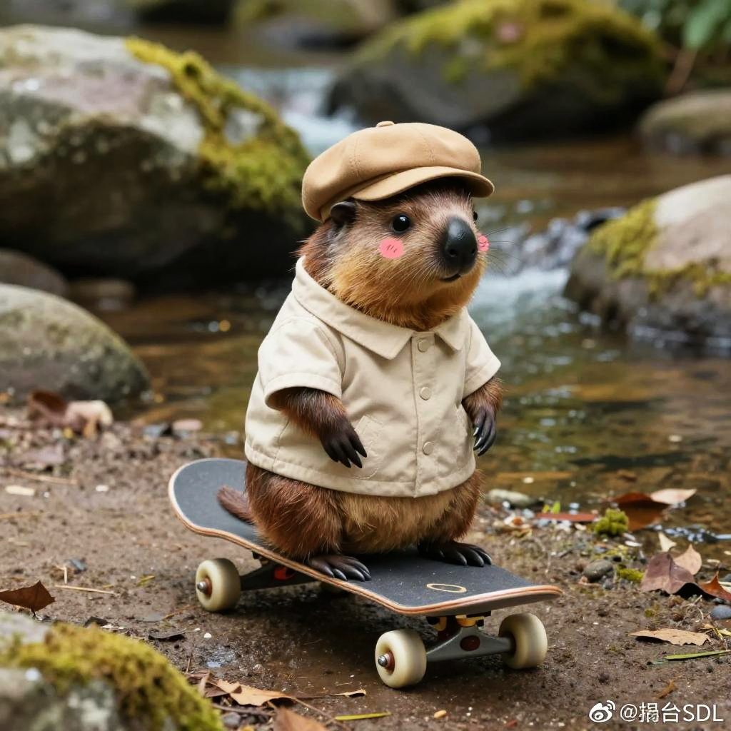 No humans, animal focus, chipmunk, clothed animal in a simple outfit, wearing green beret, full body on a skateboard, from side, solo, mischievous expression, blush stickers, set in dense autumn forest with golden trees and soft shadows, clean composition, no lineart, detailed feathers or fur, soft key light, subtle grain, balanced color, small weibo username and signature, high res SDXL, gentle shadows, slight vignette
