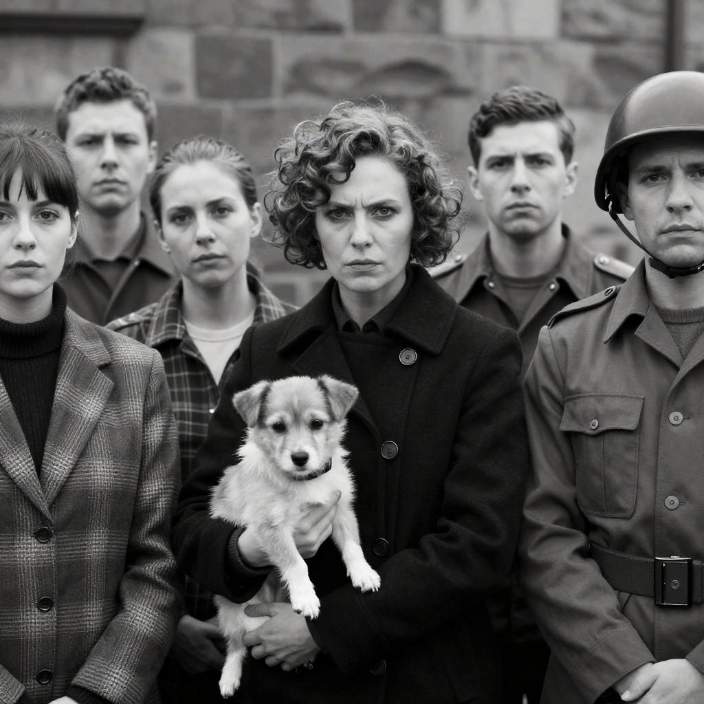 Black-and-white photograph of a group of six people. Central woman with short curly hair, intense expression, dark buttoned coat, holding a small dog. Surrounding people with varied expressions, wearing plaid and patterned clothing. Soldier in helmet on right. Stone wall background. Dense, crowded composition.