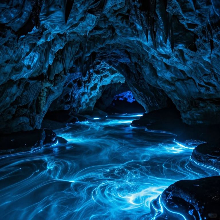 Glowing underground waters pulse rhythmically beneath a cavernous ceiling, illuminated by ethereal blue light that dances across the rocky shores and deepens into the distance.