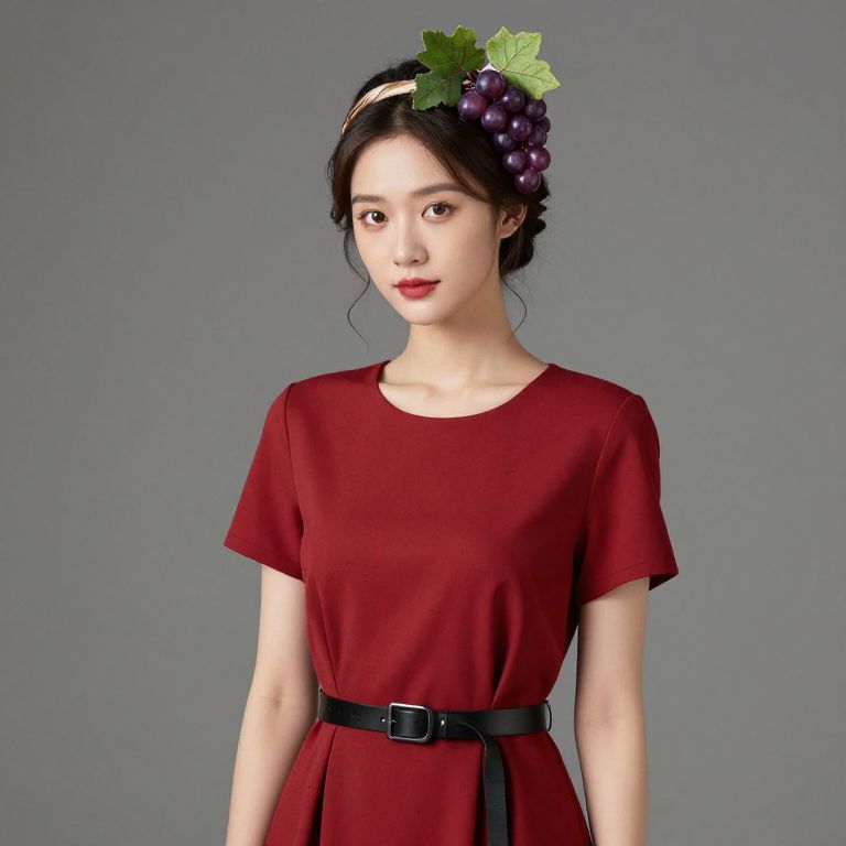 Female wearing a red dress with a black belt and a headband with grapes and leaves on it.
