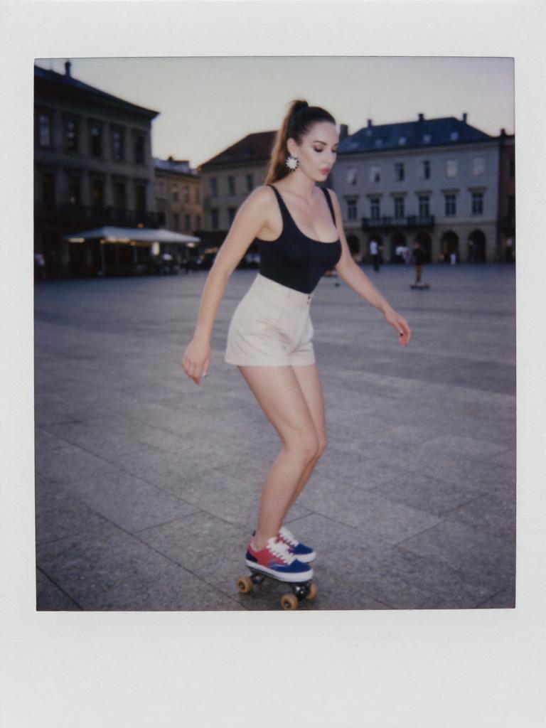 A Petite woman, casual sporty style in a black bodysuit and high-waisted beige shorts, multicolored sneakers, studded earrings, and hair in a ponytail, captured in a polaroid instant camera style, skating in a historic town square at sunset. Sexy. Pretty face and beаutiful eyes. Big breasts