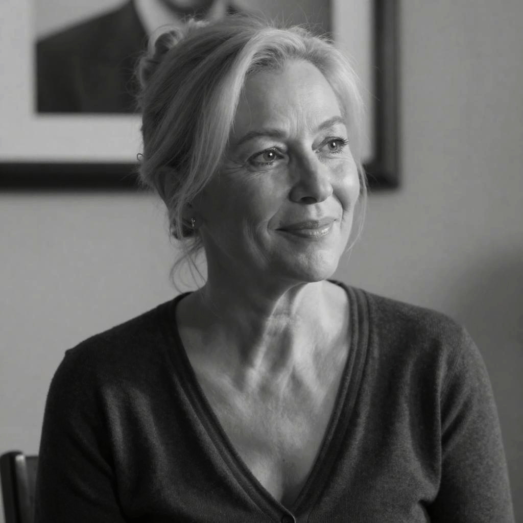 Portrait of a middle-aged Caucasian woman with blonde hair styled in a loose updo. She is wearing a blue denim button-up shirt underneath a chunky, light gray knit cardigan. She has a gentle smile, with her hands resting on her lap, showcasing a ring on her right hand. The background is dark and blurred, emphasizing the subject's calm and warm expression.
