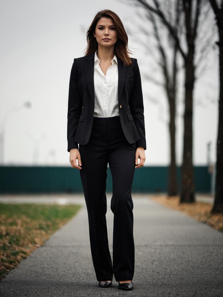 Woman dress pant suit, 1girl, solo, jacket, shirt, pants, brown hair, white shirt, black pants, full body, realistic, standing, blurry background, blurry, black jacket