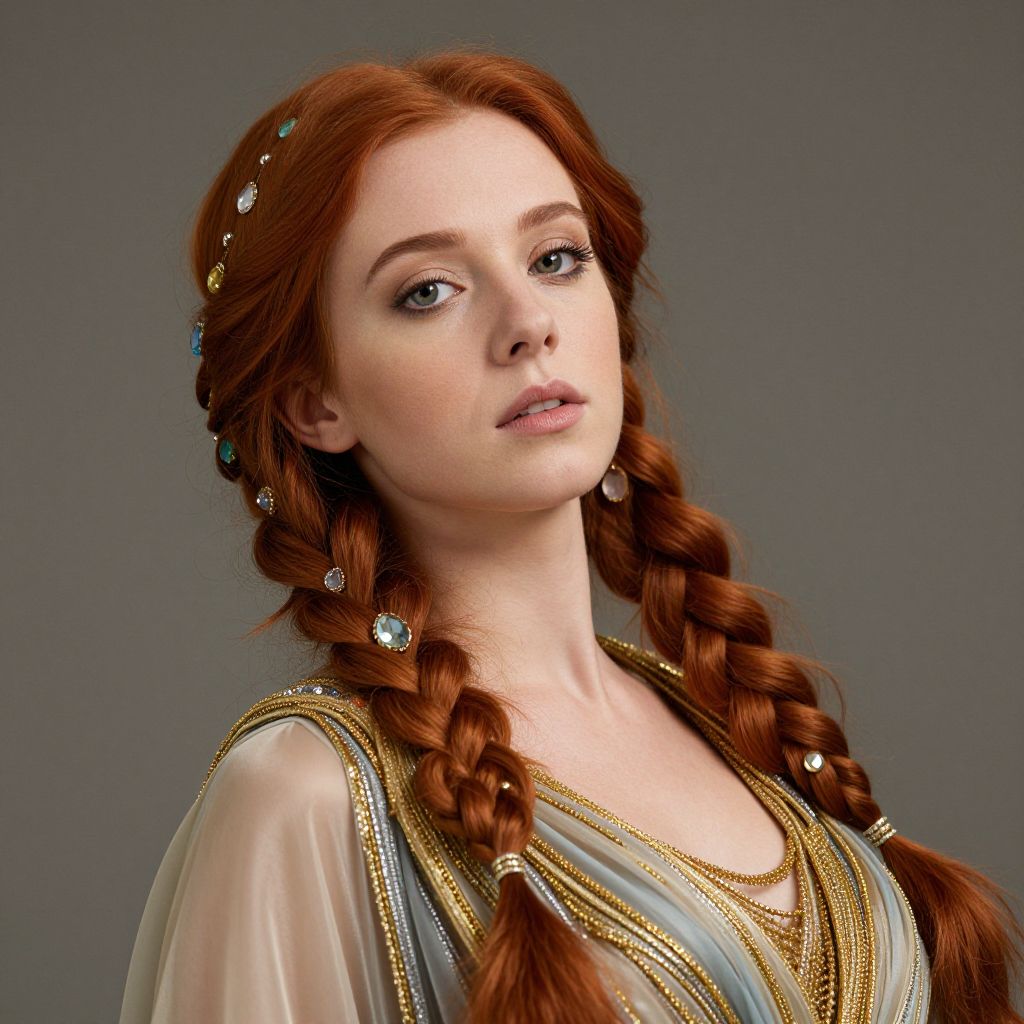 Digital portrait of a fair-skinned, red-haired woman with braided hair, adorned with gemstones, wearing an ornate, gold-trimmed