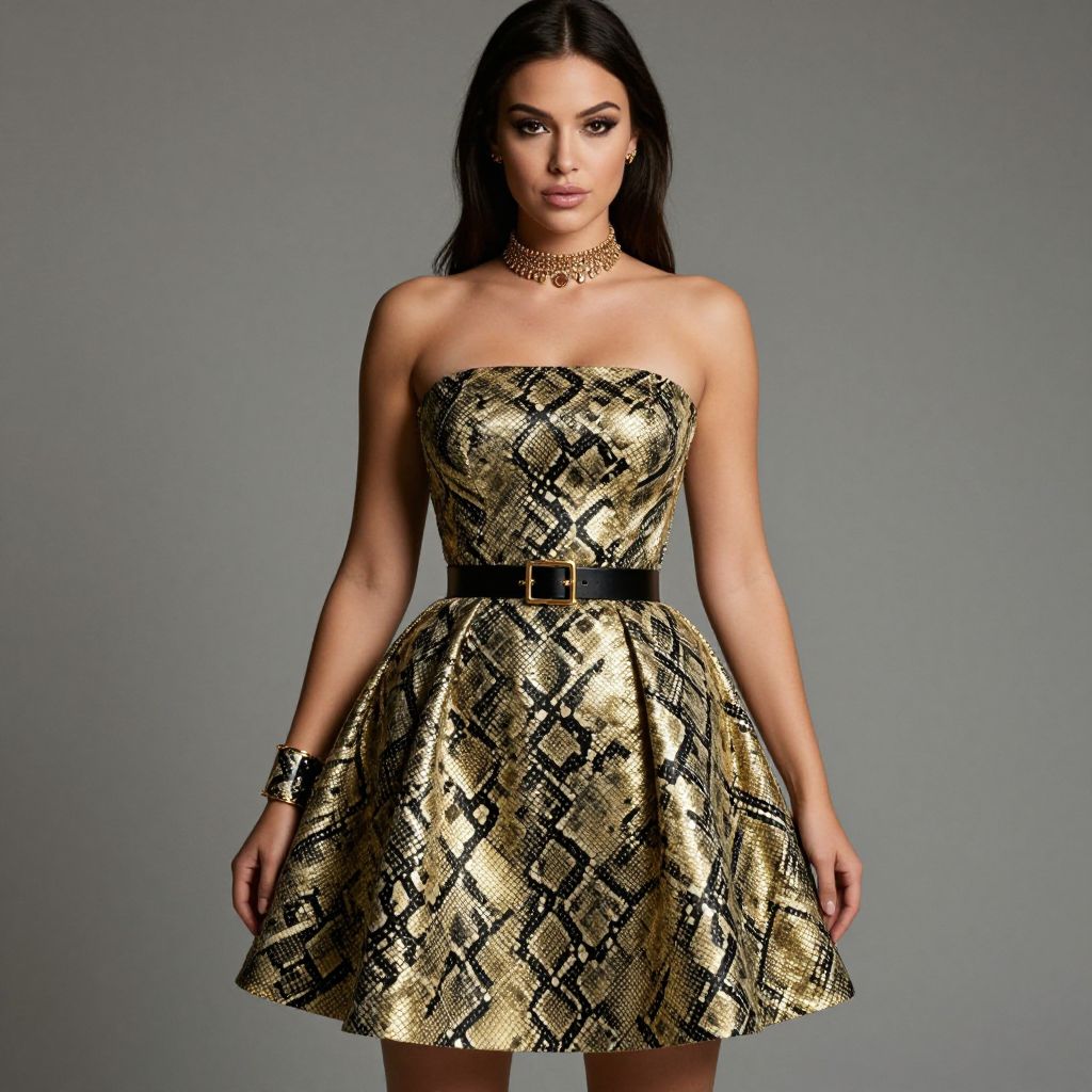 Woman, evening wear, strapless A-line mini dress, metallic gold and black snake print, straight neckline, fitted bodice, black belt at waist with gold buckle, full skirt, statement choker necklace, matching cuff bracelet.. Sexy. Pretty face and beаutiful eyes. Big breasts.