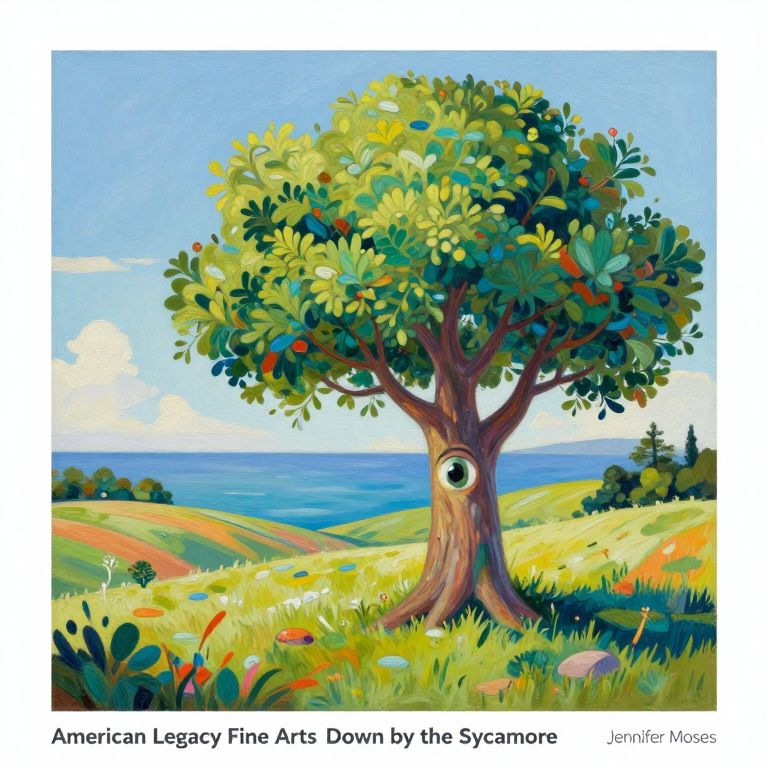 American Legacy Fine Arts showcases 'Down by the Sycamore,' a vibrant painting by Jennifer Moses, featuring a whimsical tree with a face-like eye, set against a serene landscape of rolling hills, a tranquil sea, and a bright sky, rendered in a colorful, illustrative style with detailed textures and playful elements.