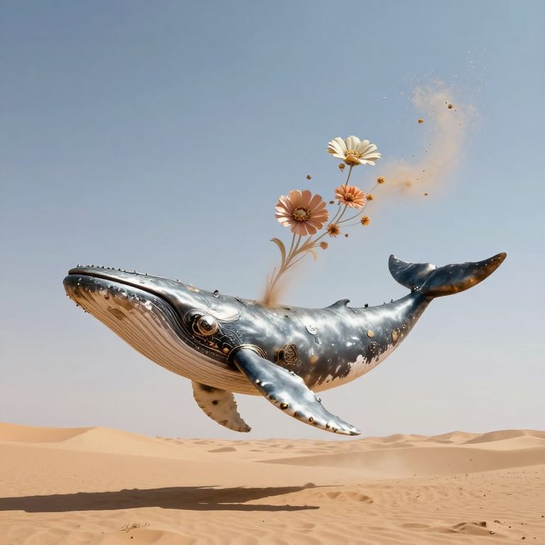 Suspended between sky and sand, the ancient mechanical whale drifts with a haunting serenity, its metallic breath transforming grains of desert into ephemeral blooms, symbolizing the fragile beauty of transience and the enduring spirit of hope in barren landscapes.