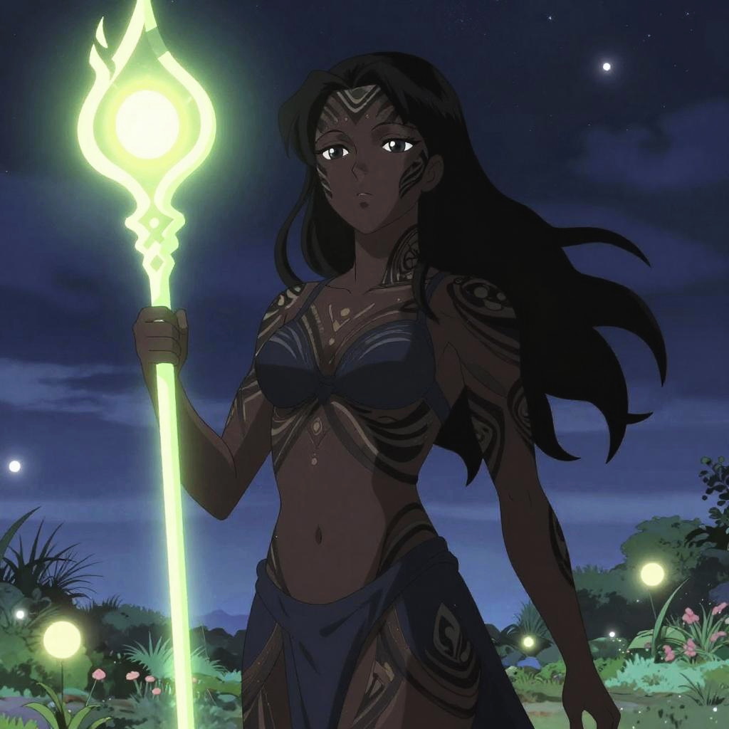 Digital anime-style drawing of a dark-skinned, tattooed woman with long black hair, holding a glowing staff, in a moonlit forest.