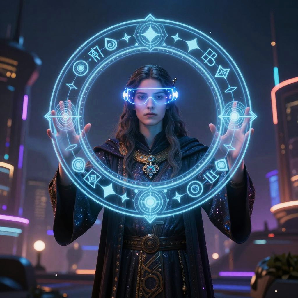 Mage.space epic scene depicting a powerful mage channeling ancient spells through augmented reality devices, magical glyphs projected in mid-air, luminous cybernetic cityscape in the background with pulsing neon accents, blending classical wizardry with advanced technology