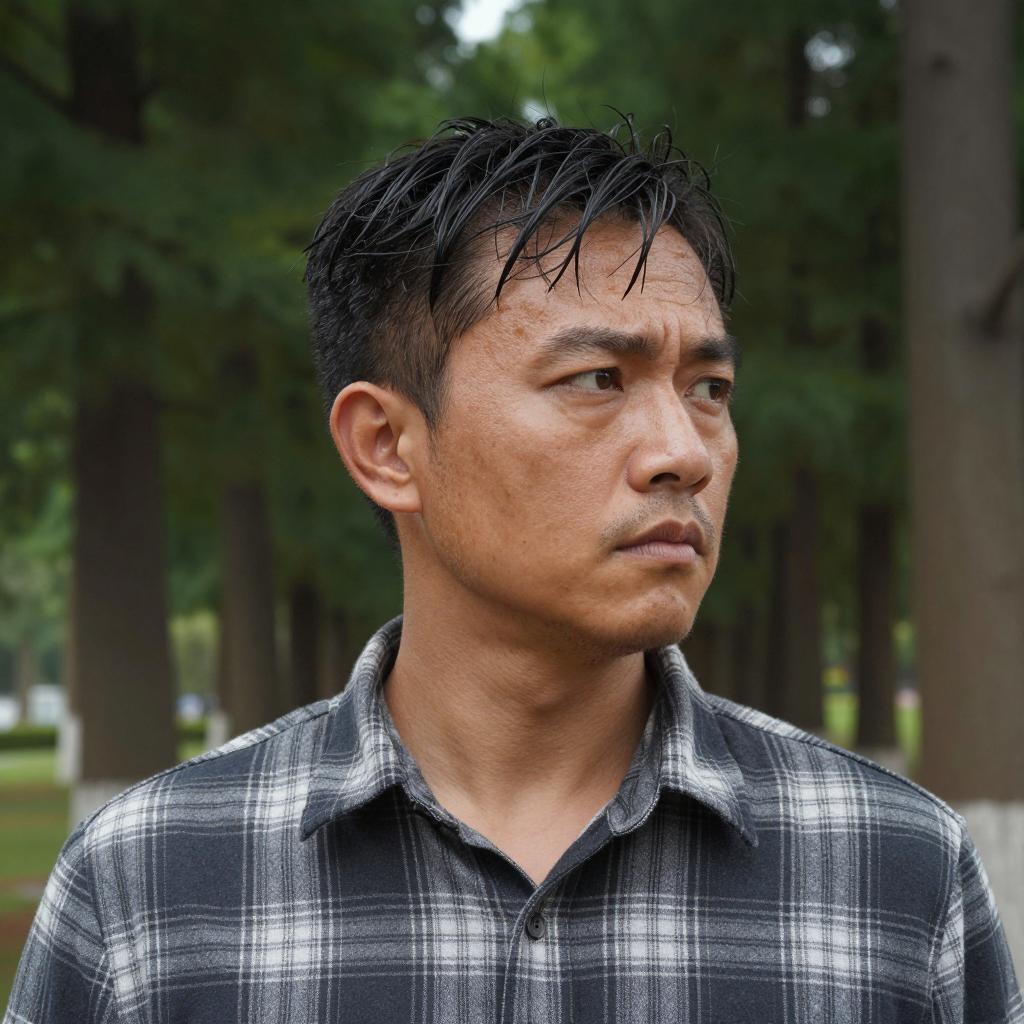 Bald man with fair skin and intense gaze, wearing a dark shirt, stands below a window with closed wooden shutters. Sunlight casts shadow patterns on the wall. Window latch is visible. Angled upward shot emphasizes man's face and neck.