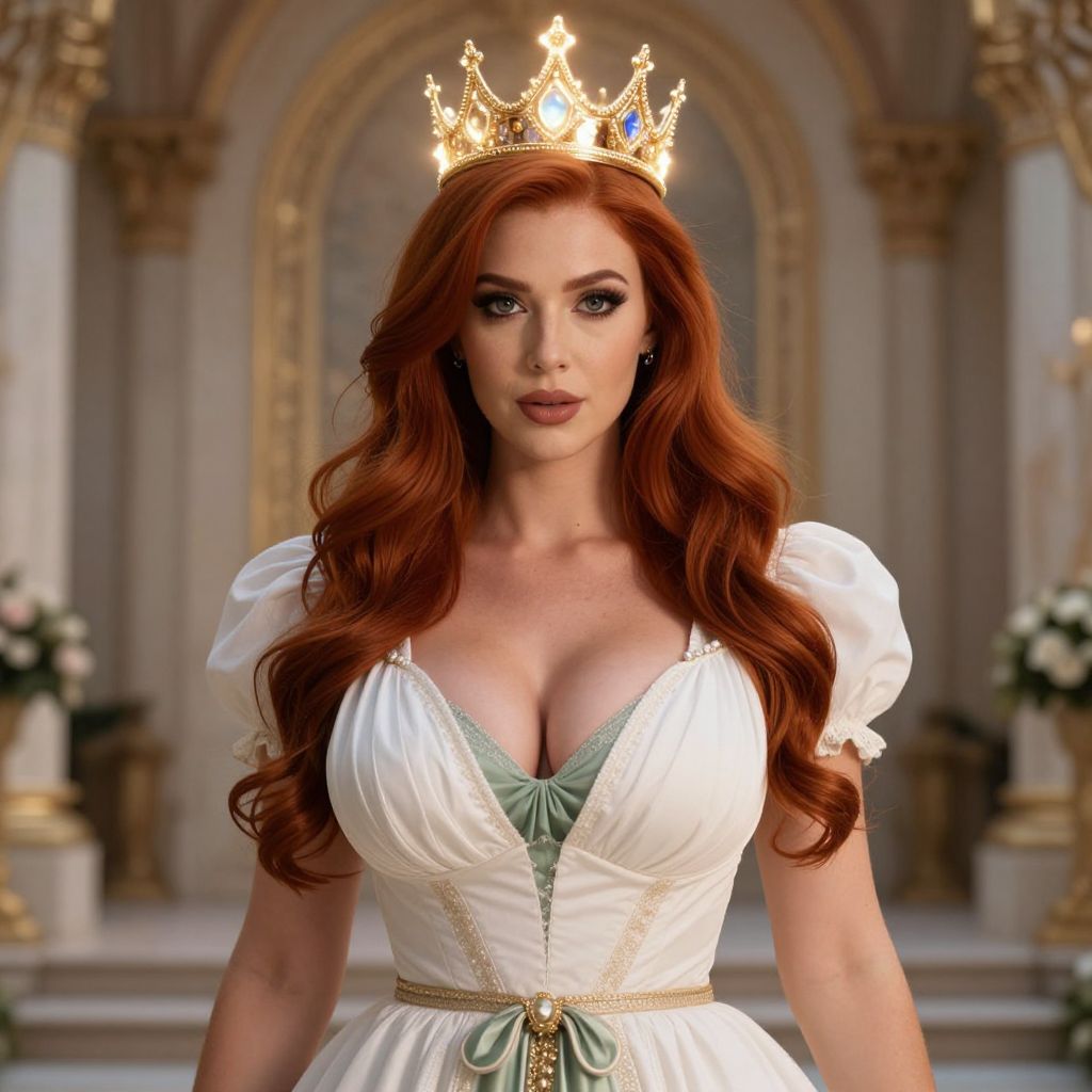 Photograph of a fair-skinned woman with long, wavy red hair, wearing a golden crown and a low-cut, white, puffed-sleeve gown with green lace trim and gold accents, revealing ample cleavage. She stands in an ornate, classical-style room with arched windows and decorative columns, featuring soft, warm lighting and floral arrangements in the background. Her makeup is dramatic with dark eyeliner and pink lipstick, giving her a regal, fairy-tale appearance. The image has a slightly CGI-enhanced, fantasy aesthetic.