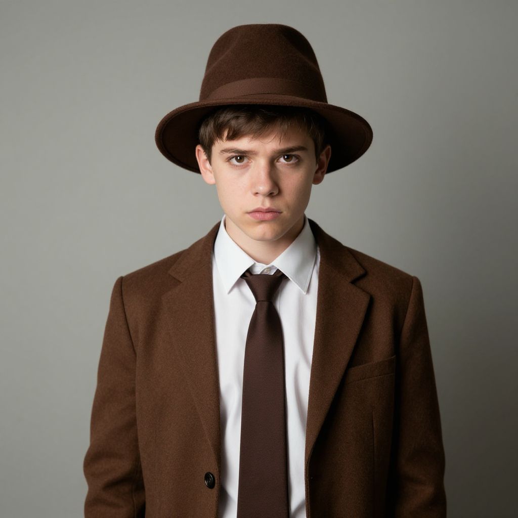Photograph of a young Caucasian male with fair skin and dark brown hair, wearing a dark brown fedora hat, white dress shirt, black tie, and brown tweed blazer. He has a solemn expression and is looking directly at the camera. The background is a plain, light gray color, providing a neutral backdrop that highlights the subject. The lighting is even, with no visible shadows. The overall style is formal and slightly retro, reminiscent of mid-20th century fashion.