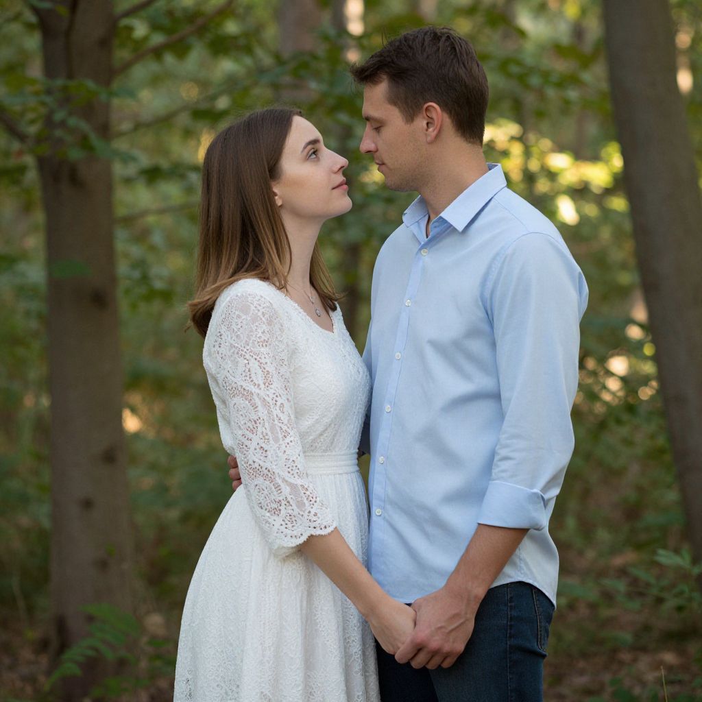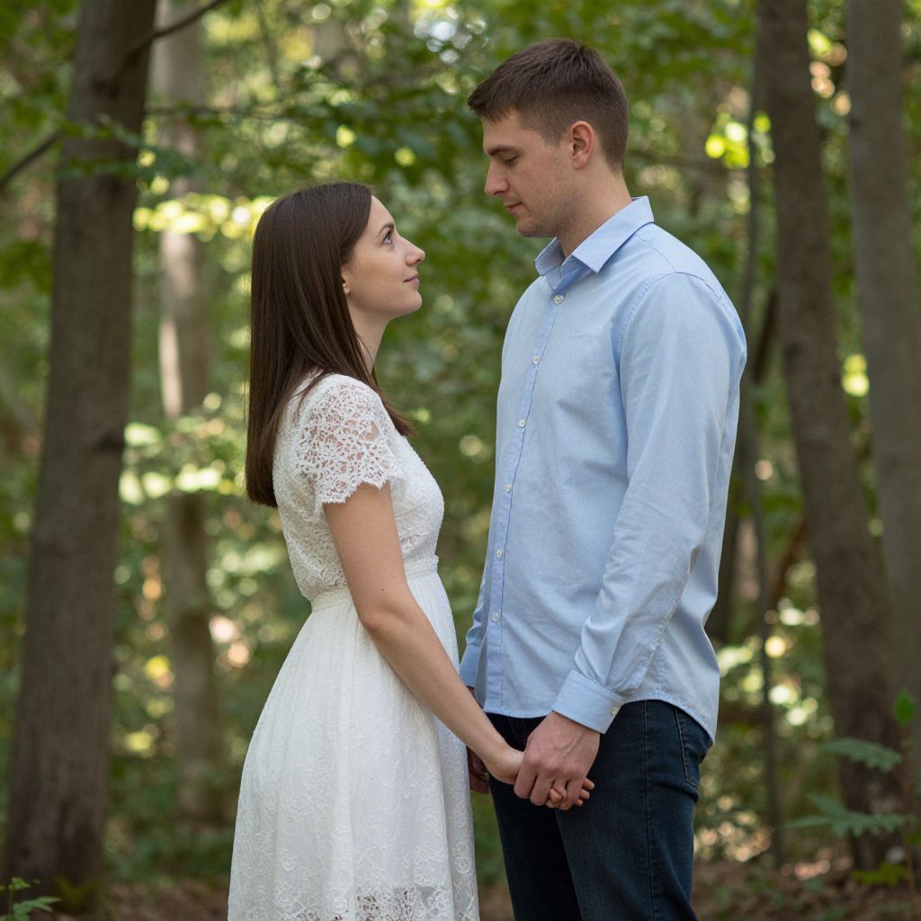 Photograph of a couple standing in a lush, green forest. The woman, with long dark brown hair and fair skin, wears a white lace dress with short sleeves, looking up at the man. The man, with short brown hair and fair skin, wears a light blue button-up shirt and dark jeans, looking down at her. They hold hands, with sunlight filtering through the trees in the background. The woman's dress has a delicate, intricate lace pattern, contrasting with the man's simpler, casual attire. The couple's expressions are tender and intimate.
