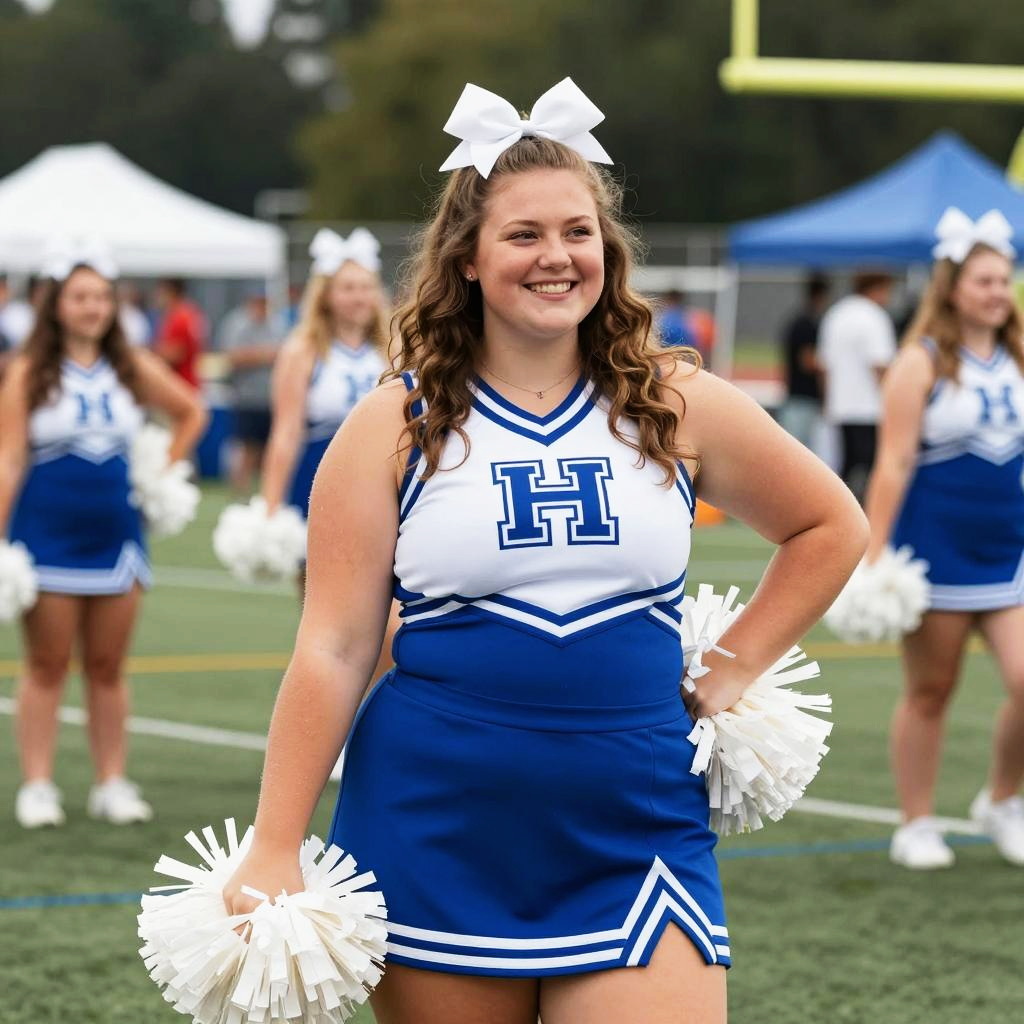 A woman in a plus-size cheerleader costume smiles confidently on a sports field during a festival event. She is wearing a blue and white cheerleading uniform with a matching bow and holding white pom-poms, embodying a sense of empowerment and team spirit in a cinematic realism style.